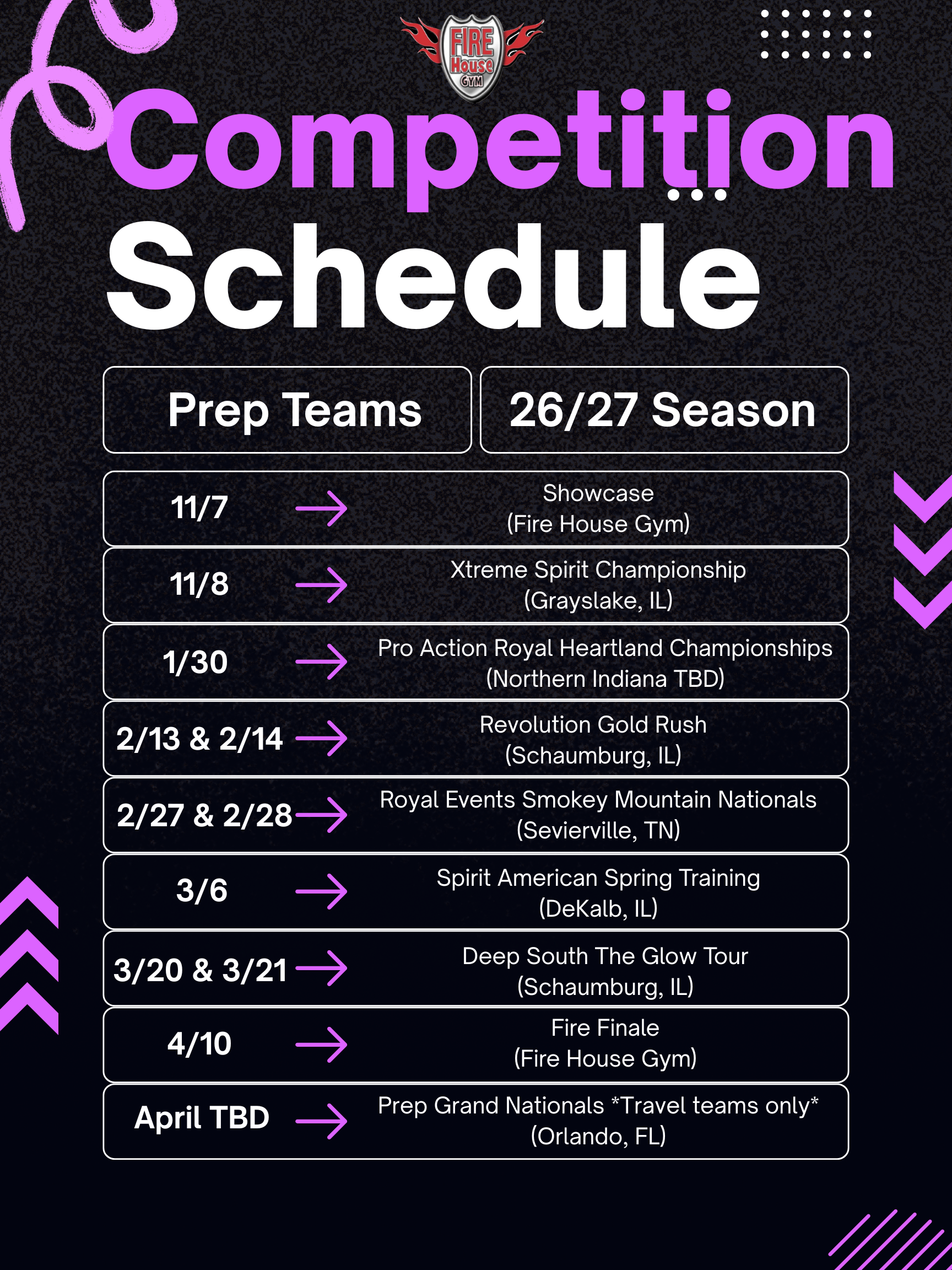 Full Season Cheerleading is the heartbeat of our cheer program! This competitive program is for both beginner and experienced cheerleaders that have found their love for the sport of cheerleading. These athletes are dedicated and are ready to make cheerleading their top priority in order to be competitive. At Fire House Gym, we have teams for all ages and skill levels. They receive professional stunt, music and choreography, making them highly competitive and successful. In addition to their teams being successful on the competition floor, you can expect these athletes to significantly grow their individual cheerleading skills each season.